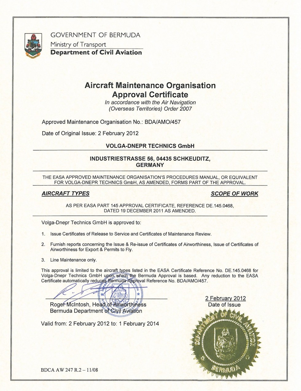 ISO 9001:2015Сертификат соответствия международному стандарту ISO 9001:2015. Сертификат покрывает такие направления деятельности ВДТМ, как техническое обслуживание и ремонт ВС типов Boeing 747-400, Boeing 747-8, Boeing 737NG, Boeing 737CL, Airbus A320 и RRJ-95 в аэропортах МАУ (Шереметьево, Внуково, Домодедово), а также ремонт компонентов и обучение инженерно-технического персонала.