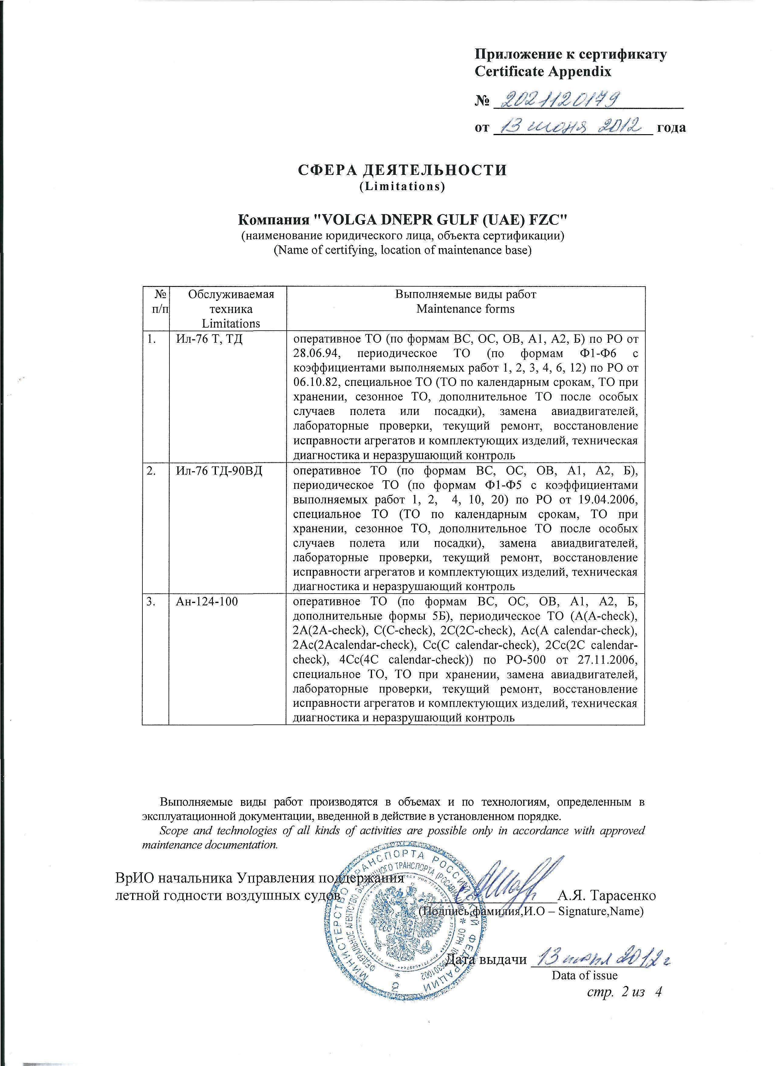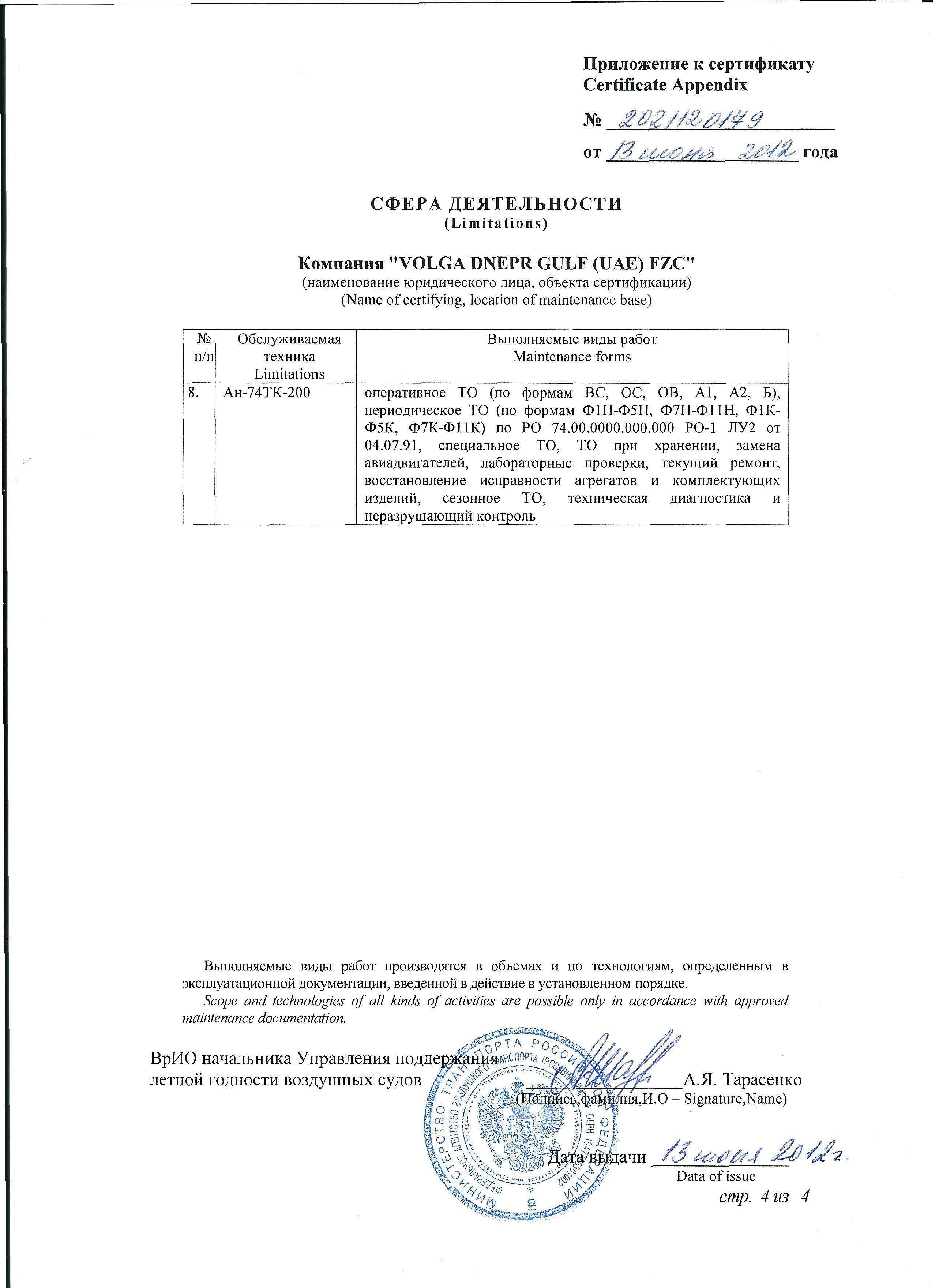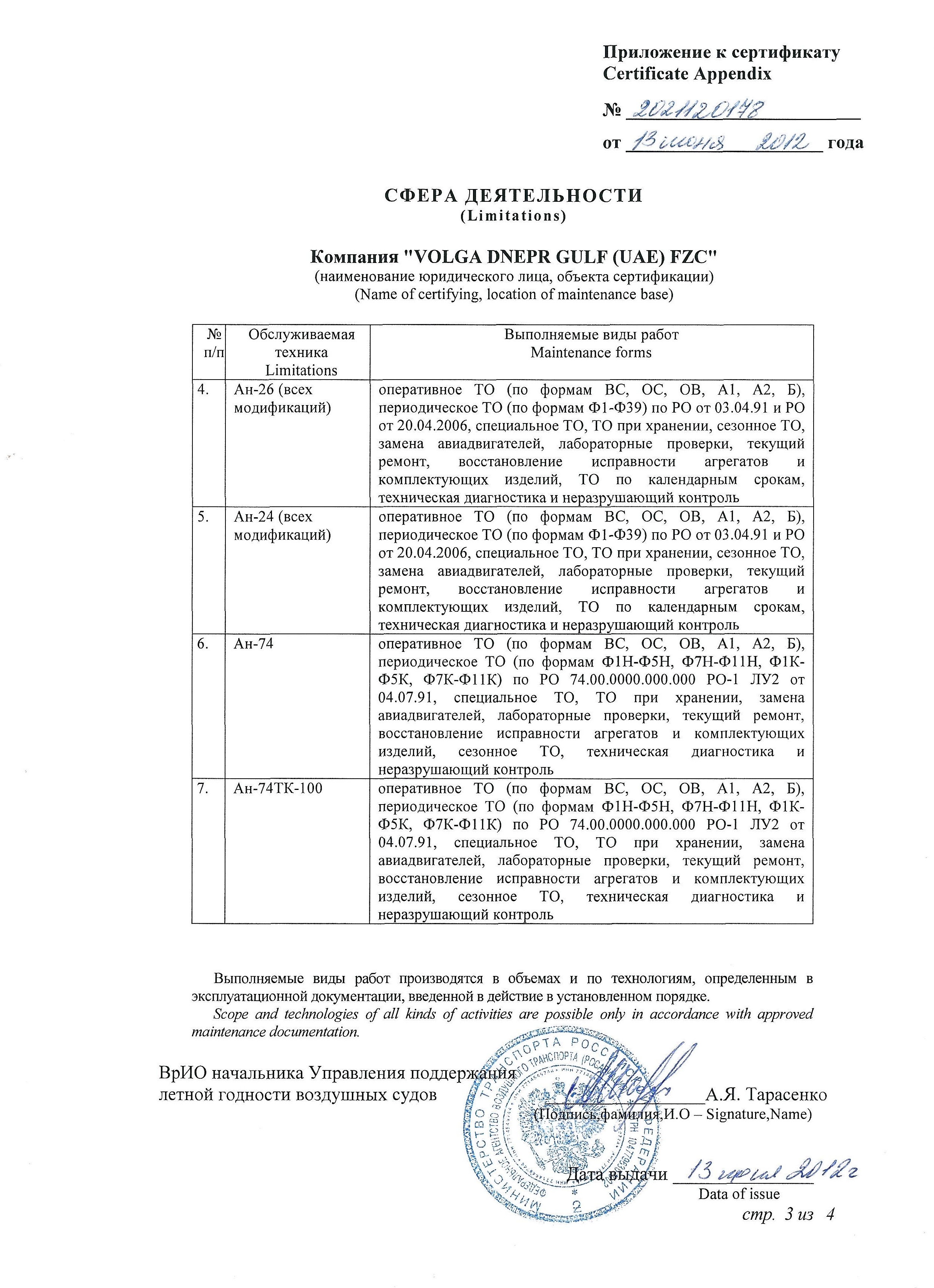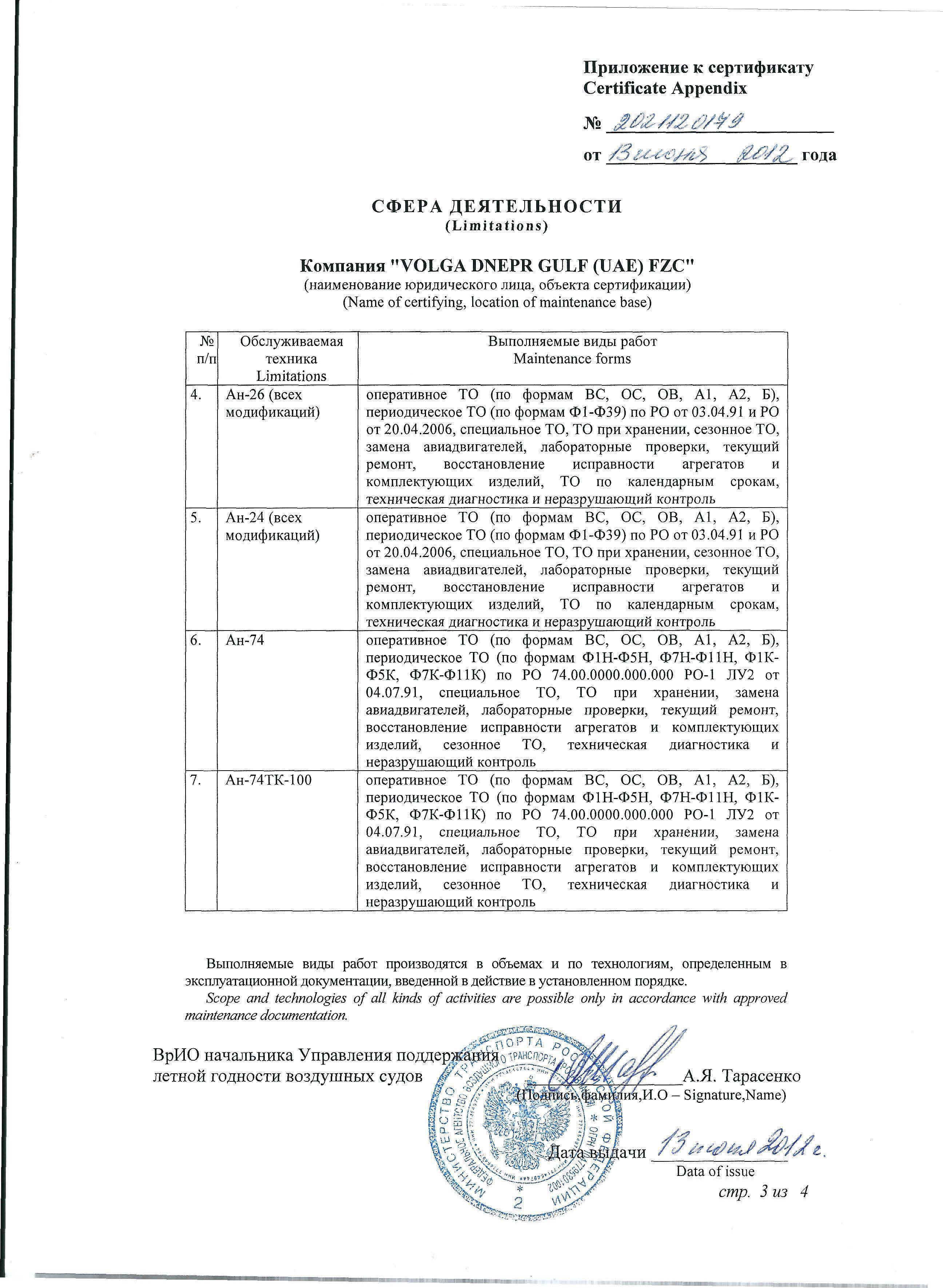 ФАП 289, Сертификат АУЦ №261Авиационный учебный центр ООО "Волга-Днепр Техникс Москва" соответствует требованиям федеральных авиационных правил и способен осуществлять обучение по направлениям (специальностям), приведенным в приложении к настоящему свидетельству.Скачать в PDF |