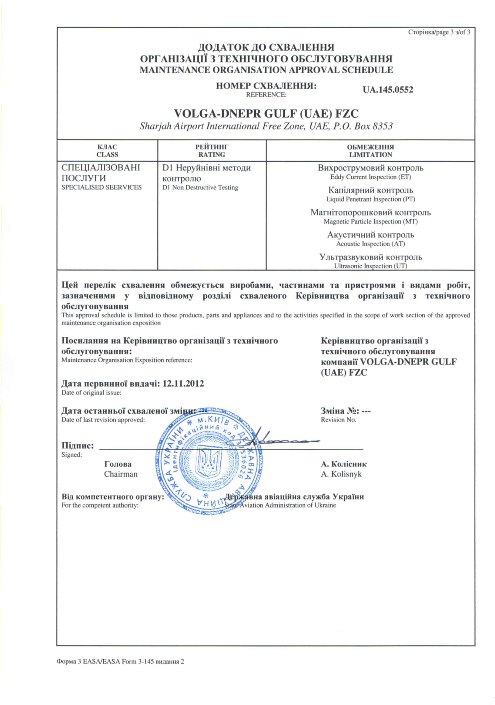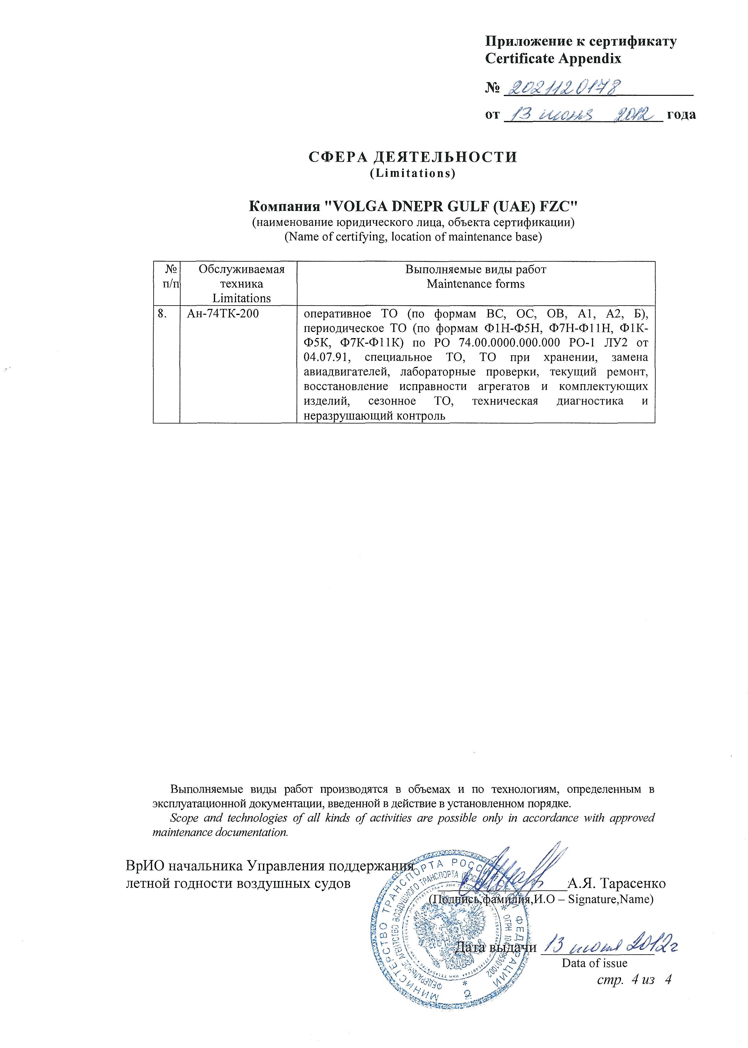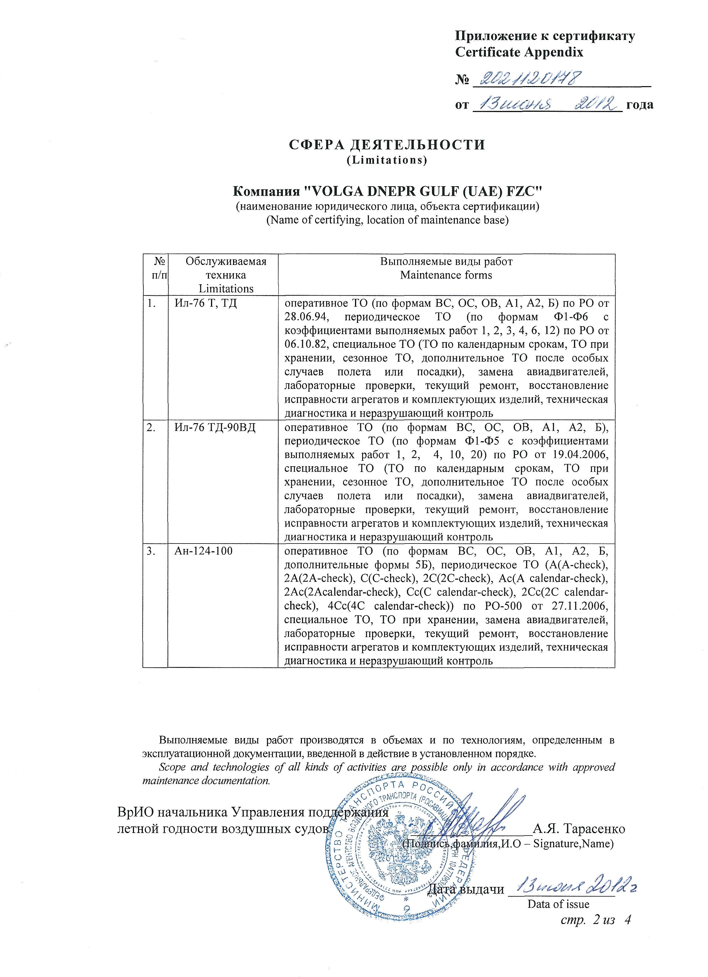 ФАП 289, Сертификат АУЦ №261Авиационный учебный центр ООО "Волга-Днепр Техникс Москва" соответствует требованиям федеральных авиационных правил и способен осуществлять обучение по направлениям (специальностям), приведенным в приложении к настоящему свидетельству.Скачать в PDF |