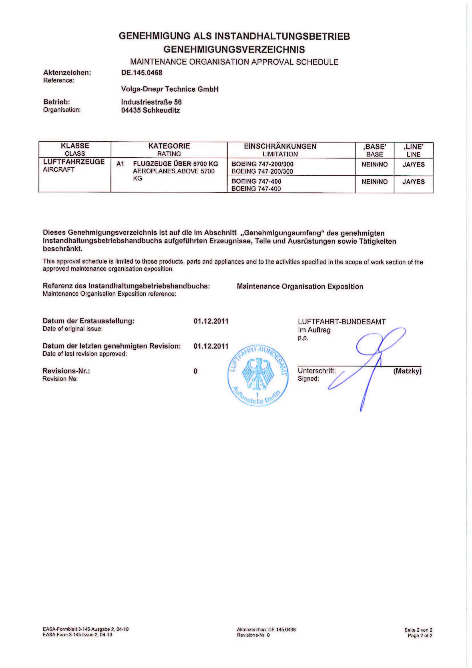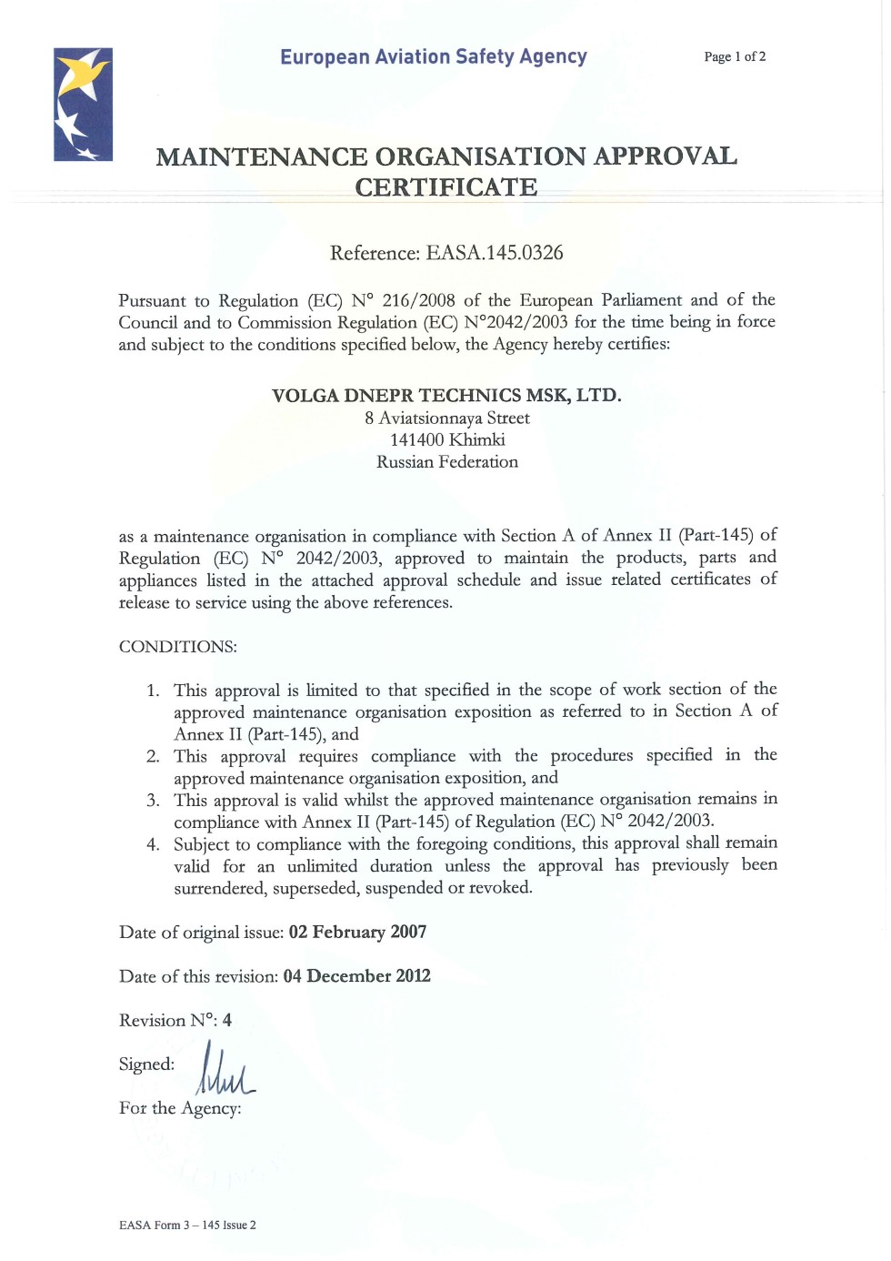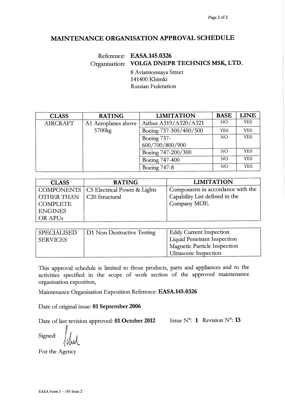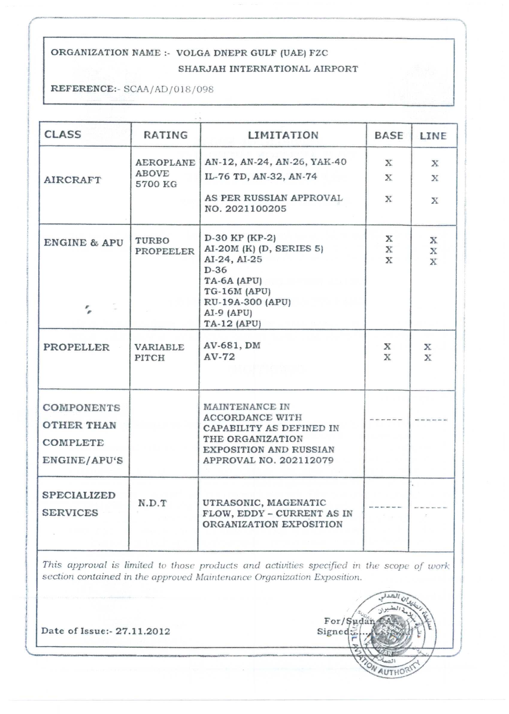 ФАП 289, Сертификат АУЦ №261Авиационный учебный центр ООО "Волга-Днепр Техникс Москва" соответствует требованиям федеральных авиационных правил и способен осуществлять обучение по направлениям (специальностям), приведенным в приложении к настоящему свидетельству.Скачать в PDF |